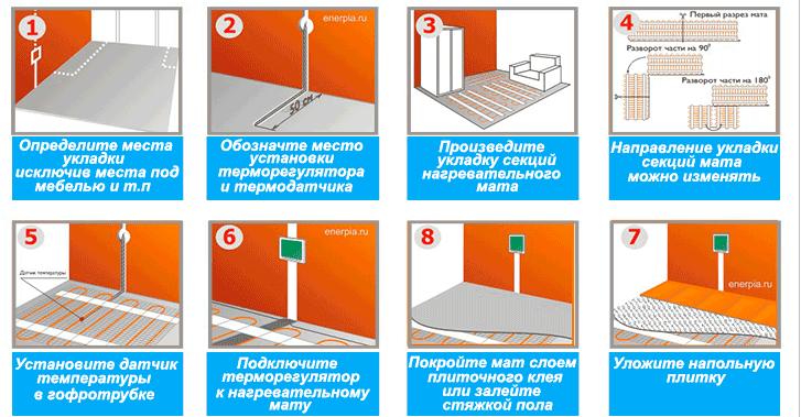 Une couche de matériau réfléchissant la chaleur est posée sur une surface plane et nettoyée de la base. Cette couche empêchera la chaleur de descendre à travers la chape. Un film infrarouge est posé sur l'isolation thermique. Les feuilles sont empilées en parallèle, le chevauchement des bords des feuilles n'est pas autorisé. En outre, soit une chape mince est réalisée avec la pose d'un treillis polymère, soit des feuilles de magnésite de verre ou de fibre de gypse sont posées sur le film chauffant. Ensuite, de la colle à carrelage est appliquée sur la chape ou les feuilles séchées, et des carreaux de céramique ou de marbre sont posés.