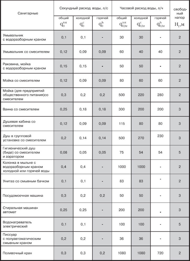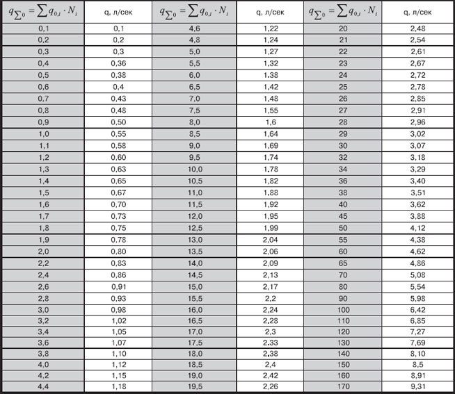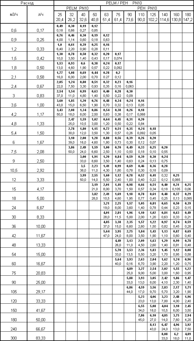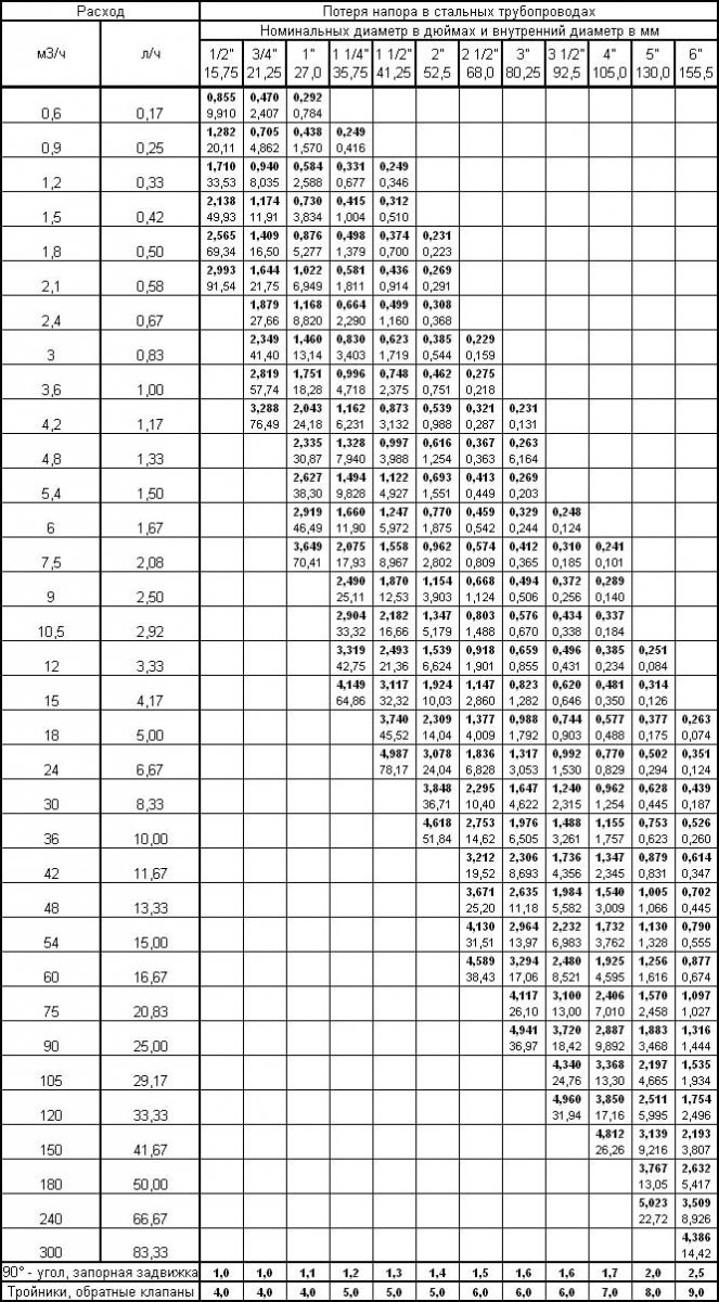 Pour faciliter le calcul de la perte de charge (R), vous pouvez utiliser un tableau spécial, qui prend en compte les diamètres de tuyaux possibles et fournit des informations supplémentaires.