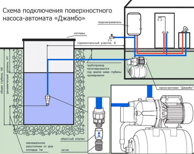 Si la hauteur est calculée pour 9 mètres à la maison, alors nous faisons l'opération de calcul de la puissance du sédiment en utilisant la formule comme celle-ci: (9 + 6) * 1,15 = 17,25. C'est la caractéristique minimale, maintenant la distance entre le miroir d'eau dans le puits et la surface de la terre doit être ajoutée à la hauteur calculée. Soit 40. Que se passe-t-il? 40 + 17,25 = 57,25. Si la source d'alimentation en eau est à 50 mètres de la maison, la pompe doit avoir une force de pression: 57,25 + 5 = 62,25 mètres.