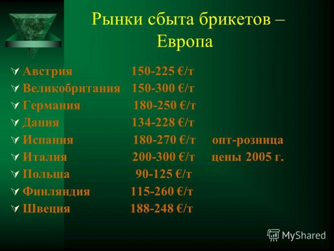 Lors de la formation d'un plan pour créer une entreprise de production de briquettes de combustible et de la détermination du bénéfice estimé, les tendances dans la formation des prix des produits finis n'occupent pas la dernière place. Les prix indiqués ci-dessous sont approximatifs et montrent l'indicateur moyen pour 1 tonne de briquette de combustible.