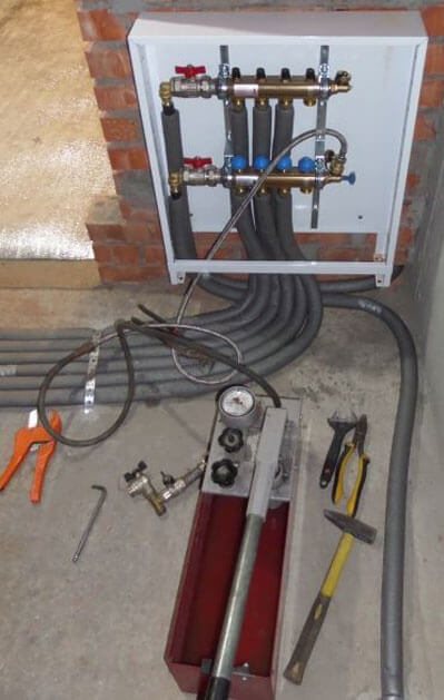 - Test de pression primaire - effectué immédiatement après l'achèvement des travaux d'installation. Le diagnostic est effectué avant que les tuyaux ne soient noyés dans les rainures. Le système de chauffage par le sol doit également être accessible - il ne doit pas être coulé avant le sertissage. Il est à noter qu'il est permis de re-diagnostiquer tous les contours après avoir réalisé la chape et le scellement. Dans ce cas, vous pouvez vous débarrasser du problème.