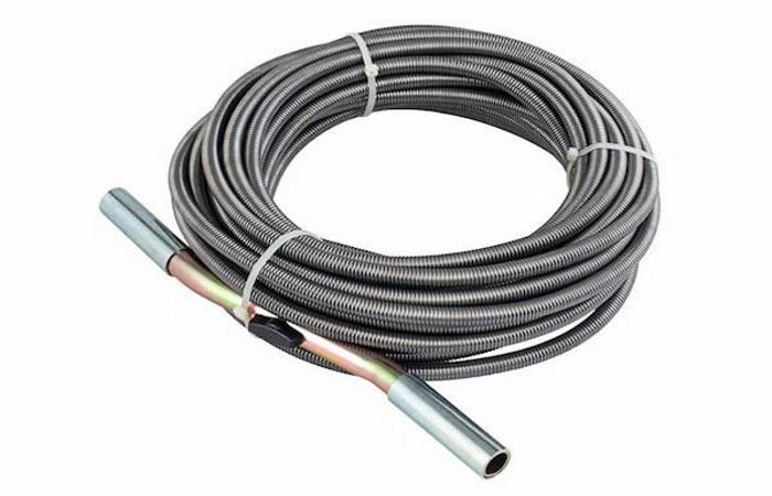 Ressort chargé semblable à un arbre flexible, se compose d'un ressort hélicoïdal. Longueur - jusqu'à 25 m, diamètre - jusqu'à 13,5 mm. Les produits à ressort tressés en plastique sont utilisés pour nettoyer les tuyaux en plastique afin de ne pas endommager les tuyaux eux-mêmes, ainsi que les cavités de plomberie de l'intérieur.