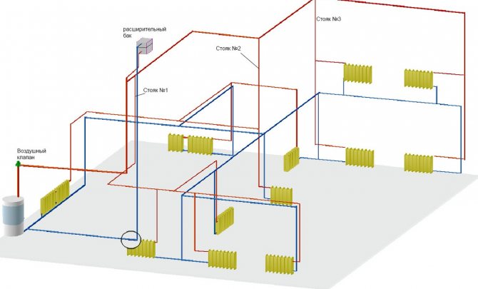 Le système de chauffage à deux tuyaux dans une maison privée à circulation naturelle présente les caractéristiques de conception suivantes: