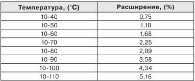Commençons à calculer.Tout d'abord, il est nécessaire de déterminer le coefficient de dilatation de l'eau dans le système de chauffage. Pour ce faire, nous avons besoin d'un tel tableau, avec les données d'expansion calculées, pour des plages de température spécifiques.