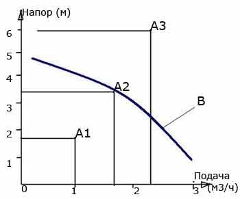 Après avoir terminé les calculs et déterminé les principaux paramètres (débit et pression), nous procéderons à la sélection d'une pompe de circulation appropriée. Pour ce faire, nous utilisons des graphiques de leurs caractéristiques techniques (B), qui se trouvent dans le passeport ou le mode d'emploi. Un tel graphique doit avoir deux axes avec les valeurs de hauteur (généralement en m) et de débit (capacité) en m3 / h, l / h ou l / s. Sur ce graphique, nous traçons les données obtenues lors du calcul, dans la dimension appropriée et à leur intersection, nous trouvons le point (A). S'il est au-dessus de la courbe caractéristique de la pompe (A3), alors ce modèle ne nous convient pas. Si le point tombe sur le graphique (A2) ou est en dessous (A1), alors c'est une option appropriée. Mais il faut garder à l'esprit que si le point est nettement inférieur au graphique (A1), cela signifie que la pompe aura une réserve de marche excessive, ce qui est également peu pratique, car elle consommera plus d'électricité et son coût sera également être plus haut que le modèle, le graphe caractéristique qui sera le plus proche possible de notre point.