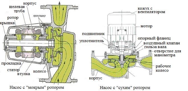 Toutes les pompes de circulation utilisées pour équiper les systèmes de chauffage sont divisées en deux grandes catégories : les appareils à rotor "humide" et "sec". Dans les pompes du premier type, tous les éléments du rotor sont constamment dans le fluide caloporteur et dans les appareils à rotor "sec", seule une partie de ces éléments est en contact avec le fluide pompé. Les pompes à rotor "sec" se distinguent par une plus grande puissance et un rendement plus élevé, mais elles font beaucoup de bruit pendant le fonctionnement, ce qui ne peut pas être dit des appareils à rotor "humide", qui émettent un minimum de bruit.