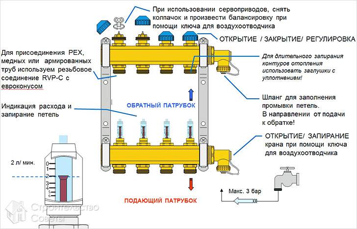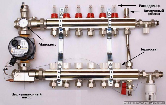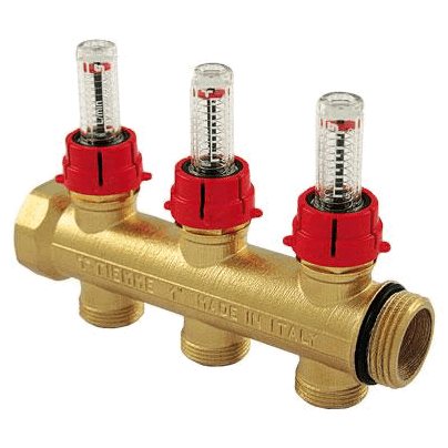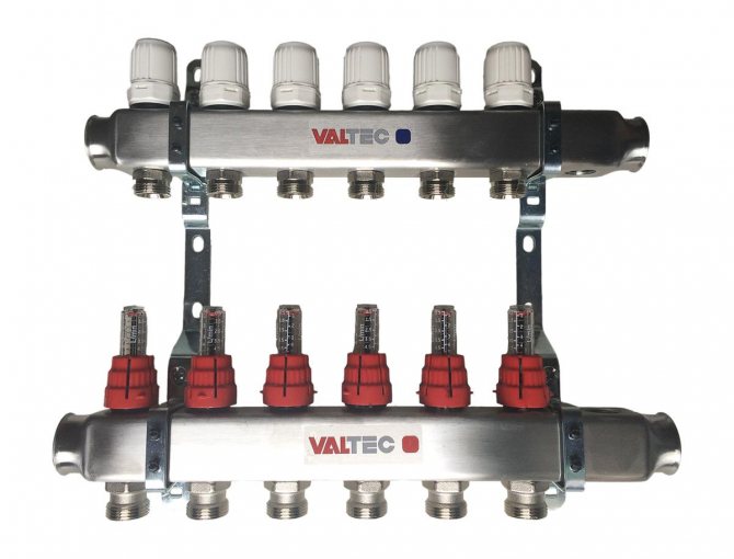 Pour un plancher d'eau dans une maison privée, il est préférable d'utiliser des collecteurs avec des débitmètres, dans ce cas, il sera beaucoup plus facile de contrôler le système. Si vous lisez cet article, mais que vous avez un sol chaud similaire dans un appartement ou une maison avec chauffage central, faites attention à la pression de service maximale du capteur que vous avez choisi, généralement pour les capteurs avec débitmètre, elle est de 6 bars. Cela peut ne pas être suffisant pour le système central.