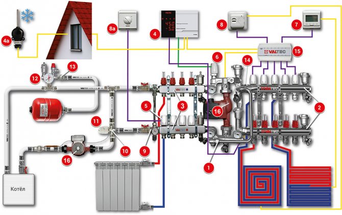 Nous attirons votre attention sur un exemple de système de chauffage moderne et économe en énergie basé sur l'équipement VALTEC. Il est conçu pour une maison de campagne ou tout autre objet avec une source de chaleur autonome (chaudière, etc.). Le schéma prévoit l'utilisation combinée de radiateurs traditionnels et de chauffage par le sol. Cette combinaison de technologies, ainsi que l'automatisation appliquée permettent d'offrir un haut niveau de confort à des coûts optimaux pour l'achat des équipements et leur fonctionnement. Le diagramme utilise et affiche les composants de l'assortiment VALTEC actuel.