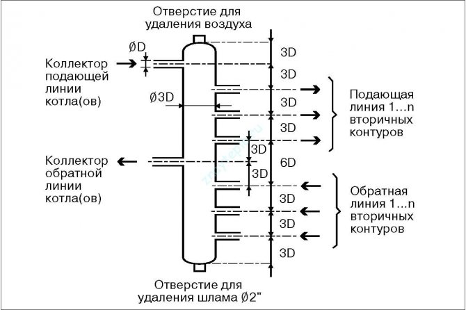 L'essence ici est similaire à celle mise en œuvre dans la conception verticale. Mais il y a une légère différence dans la tuyauterie. Ici à qui, quoi plus confortable il faut regarder la place. Un tel collecteur peut être réalisé à partir d'un tuyau en polypropylène de grand diamètre. Dans ce cas, il est conseillé de conserver les proportions indiquées sur la figure.