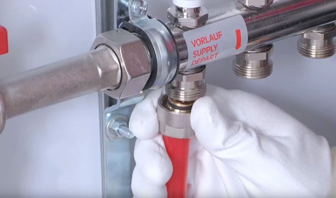 - Le réglage proprement dit se fait en fonction du débit réel du liquide de refroidissement. Pour cela, il est nécessaire de placer un rotamètre de mesure devant la partie alimentation du capteur de chauffage au sol. Sur la base de ses lectures, il sera possible de répartir les coûts totaux le long des circuits connectés au groupe collecteur.