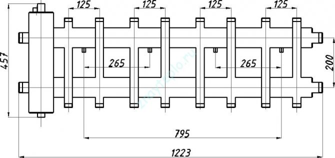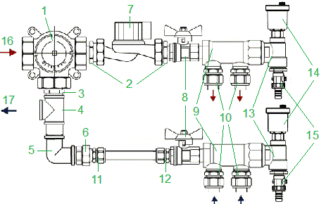 Collecteur de chauffage par le sol Valtec avec réglage manuel pour 2 circuits. Les charnières doivent être de longueur approximativement égale pour un bon fonctionnement. A l'entrée et à la sortie du système de chauffage 16, 17, il est conseillé de monter des robinets américains.