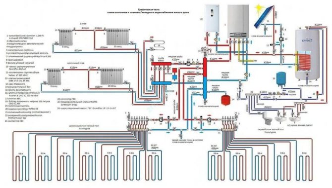 La figure montre un schéma sans chaudière à chauffage indirect. Ceci est fait ici car une chaudière à gaz à double circuit est utilisée. Eh bien, si la chaudière est à circuit unique, alors tout sera un peu différent:
