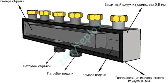 En règle générale, un sol isolé par l'eau se compose de plusieurs circuits de tuyaux en plastique. L'eau chaude qui les traverse, dégage sa chaleur et revient par la partie retour du système. Le collecteur (système de peigne) du plancher d'eau chaude est conçu pour collecter l'eau refroidie, mélanger et fournir de l'eau chauffée. En d'autres termes, c'est une unité qui contrôle le fonctionnement du système de chauffage par le sol.
