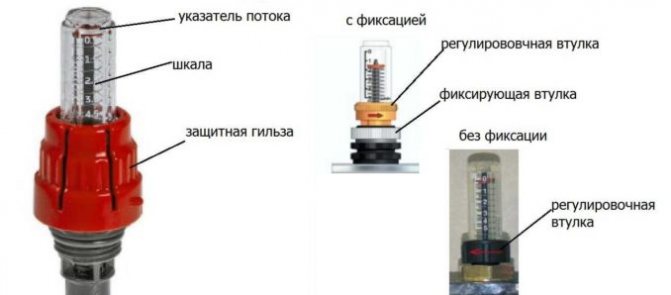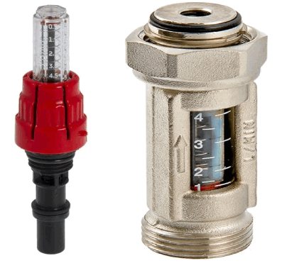 Débitmètre traditionnel pour capteurs de chauffage par le sol en différentes versions: à gauche - dans un boîtier en plastique, à droite - en laiton.