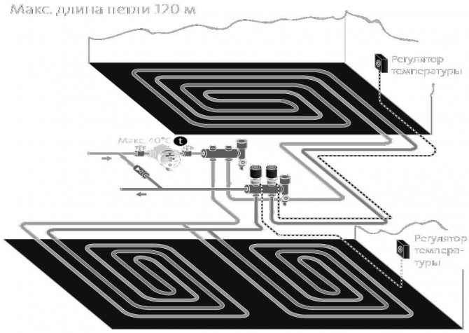 Conseils! Lors de l'installation d'un sol chauffé à l'eau, vous devez vous efforcer de créer les contours des tuyaux d'environ la même longueur. Cela réduira les coûts énergétiques et permettra un contrôle plus précis de la température.