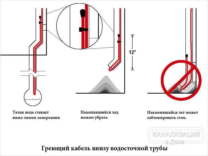 Le principe de fonctionnement du système de chauffage par drainage est basé sur l'utilisation de l'énergie thermique, qui se forme lorsque l'électricité passe à travers un câble flexible ayant une certaine résistance. L'installation de chauffage est réalisée dans les endroits où il y a la moindre possibilité de glace formation. En règle générale, les éléments chauffants sont posés sur le toit, le long des gouttières et des contremarches. La chaleur aide à faire fondre la neige et empêche l'eau de geler dans le système de drainage lorsque la température descend en dessous de 0 ° C.