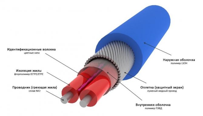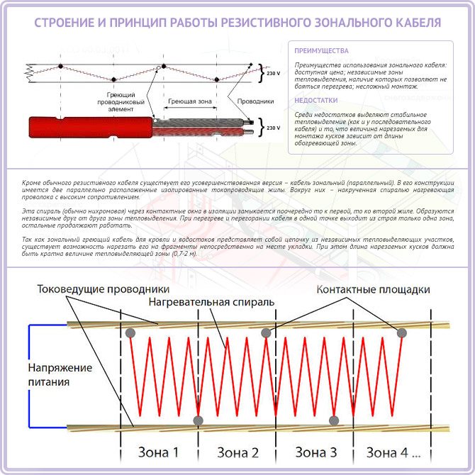Le câble résistif est disponible en deux versions - série et zone. Zonal est une version améliorée de séquentiel. Il y a -2 noyaux dans sa structure, connectés à intervalles réguliers avec un fil spécial. Ces vides forment des zones indépendantes, et si l'un brûle, les autres continuent à fonctionner normalement. Si le câble série brûle, il ne sera pas possible de le restaurer.