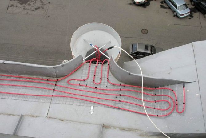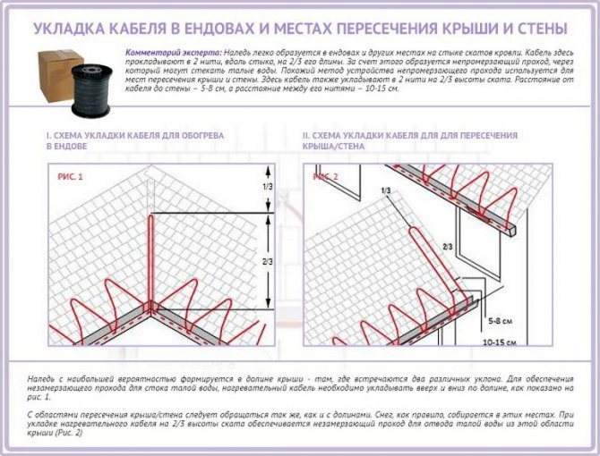 Pour que l'eau de fonte ne s'attarde pas, un câble chauffant est tiré le long de la connexion du point inférieur en deux brins, n'atteignant pas un tiers jusqu'au bord supérieur. Dans les vallées, le câble est tiré des deux côtés de la ligne de connexion, dans les joints du mur et du toit - à 5-8 cm du mur.La distance entre les câbles parallèles est de 10 à 15 cm.