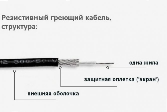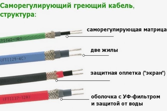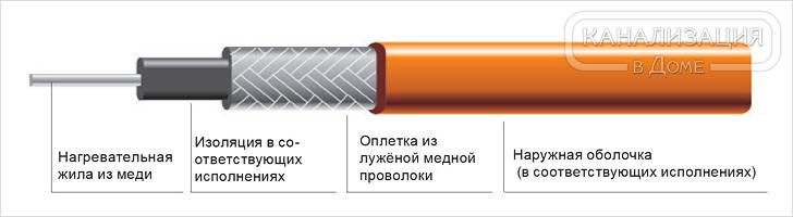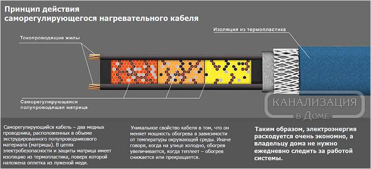 Le câble chauffant pour le drain présente les caractéristiques suivantes: le câble résistif ne répond pas à la température ambiante, le câble autorégulant, à son tour, modifie le degré de chauffage en fonction de la température ambiante, ce qui permet de réguler l'énergie consommation sans contrôle d'allumage et d'extinction.