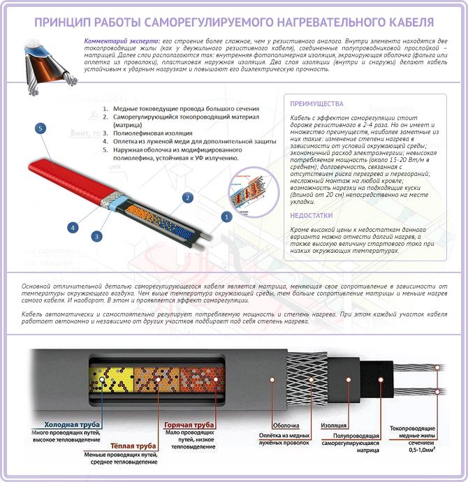 Les deux types de câbles chauffants ont leurs avantages et leurs inconvénients. Quant au coût, alors le conducteur résistif vous coûtera moins cher... Cependant, l'autorégulation est facile à utiliser en raison de ses propriétés de maintenir la température optimale et de rendre la consommation d'énergie économique.