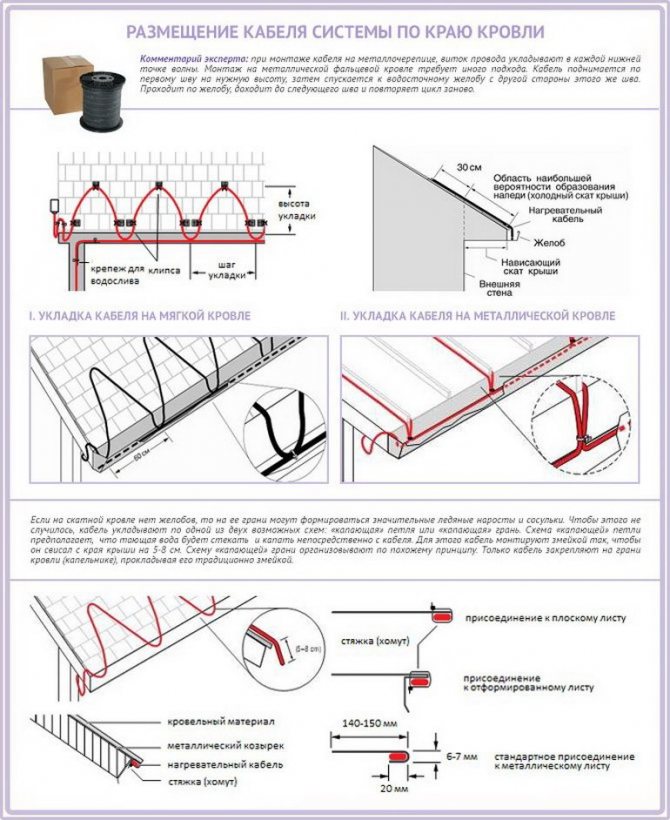 La façon dont l'élément chauffant est placé au bord du toit dépend de la forme du toit et du matériau de la toiture, de la présence ou de l'absence d'un drain. Un serpent provenant d'un câble chauffant est posé le long de la surface du toit le long du surplomb.