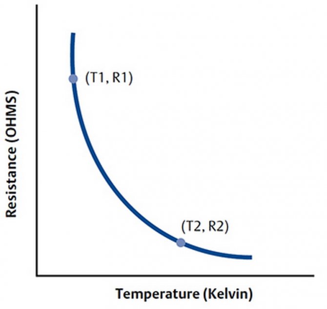 Où A, B, C - ce sont des constantes (fournies par les termes de calcul), R - résistance en Ohms, T - température en Kelvin. Vous pouvez facilement calculer le changement de température à partir d'un changement de résistance ou vice versa.