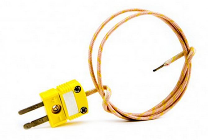 Les capteurs de température à thermocouple sont les plus couramment utilisés car ils sont précis, fonctionnent sur une large plage de températures allant de -200 ° C à 2000 ° C et sont relativement peu coûteux. Un thermocouple avec un fil et une fiche sur la photo ci-dessous: