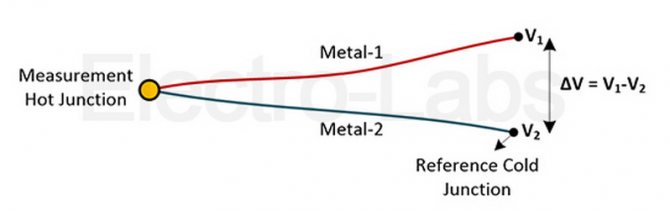 Si les deux composés sont à la même température, le potentiel de différence entre différents composés est nul, c'est-à-dire V1 = V2. Cependant, si les jonctions sont à des températures différentes, la tension de sortie relative à la différence de température entre les deux jonctions sera égale à leur différence V1 - V2.