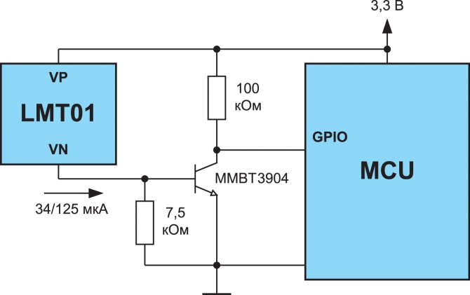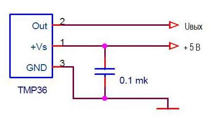 Nous parlons de capteurs de température connectés selon le schéma ci-dessus. Par exemple, il existe un circuit de commutation LM35 qui vous permet de mesurer des températures négatives. Mais il est plus difficile à mettre en œuvre et nécessite une puissance supplémentaire. Il est préférable d'utiliser le TMP36 pour les températures négatives.