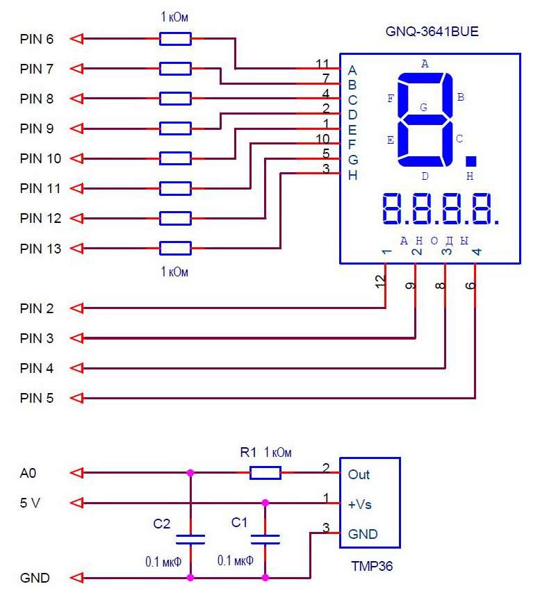 Le capteur de température est connecté à l'entrée analogique A0. Condensateur C1 - blocage de l'alimentation du capteur, R1 et C2 - le filtre analogique le plus simple. Si le capteur thermique est installé à proximité du microcontrôleur, le filtre peut être exclu du circuit.