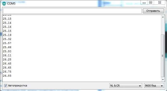- À l'aide d'un programme spécial de haut niveau (je l'ai écrit): affichez la température mesurée sur l'écran de l'ordinateur.