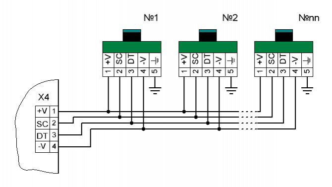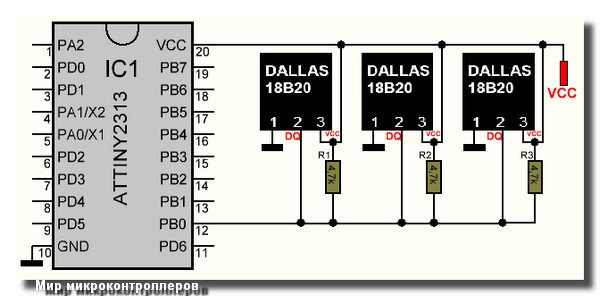 Comme vous pouvez le voir sur le schéma, le ou les capteurs DS18B20 sont connectés au microcontrôleur, s'ils ont une alimentation commune, avec trois conducteurs: - conclusion n ° 1 - fil commun (masse, terre) - conclusion numéro 2 - aka DQ, à travers lequel la communication entre MK et DS18B20 a lieu, est connecté à n'importe quelle broche de n'importe quel port de MK. La broche DQ doit être «tirée vers le haut» à travers la résistance vers l'alimentation positive - conclusion n ° 3 - alimentation du capteur - +5 volts Si l'appareil utilise plusieurs capteurs de température, ils peuvent être connectés à différentes broches du port MK, mais le volume du programme augmentera. Il est préférable de connecter les capteurs comme indiqué sur le schéma - en parallèle, à une broche du port MK. Permettez-moi de vous rappeler la taille de la résistance pull-up: «La résistance de la résistance doit être choisie à partir d'un compromis entre la résistance du câble utilisé et le bruit externe. La résistance de la résistance peut être de 5,1 à 1 kOhm. Pour les câbles à haute résistance de conducteur, une résistance plus élevée doit être utilisée.Et là où il y a des interférences industrielles, choisissez une résistance plus faible et utilisez un câble avec une section de fil plus grande. Pour les nouilles téléphoniques (4 conducteurs), une résistance de 3,3 kΩ est nécessaire pour 100 mètres. Si vous utilisez "paire torsadée", même catégorie 2, la longueur peut être augmentée jusqu'à 300 mètres "