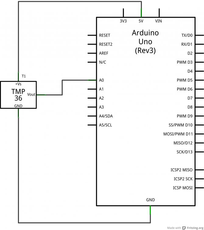 Pour tous les capteurs de température, la tension de sortie ne peut être que positive, mais en raison de la polarisation, le TMP36 est capable de mesurer des températures négatives. La tension nulle à sa sortie correspond à une température de -40 ° C, et avec une tension de sortie de 0,5 V, la température sera de 0 ° C. Je trouve que le TMP36 est le capteur de température I / C analogique le plus convivial et je les utilise assez largement.
