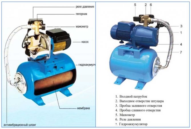Le principe de fonctionnement du mécanisme à membrane est le suivant: après le démarrage de la station de pompage, de l'eau est fournie au réservoir de l'appareil jusqu'à ce que la densité dans le système dépasse le niveau maximal admissible, après quoi le relais éteint l'accumulateur. Lorsque les robinets sont ouverts, le volume d'eau dans la chambre diminue, la pression chute, la machine met la pompe en marche et la pression se stabilise.