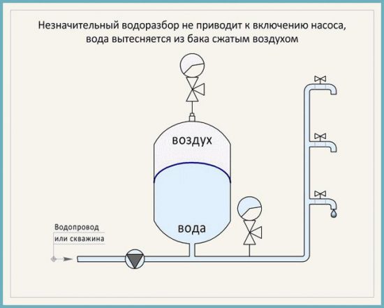 - Porter la protection de l'équipement de pompage. L'alimentation en eau contenue dans le réservoir permet pendant un certain temps d'utiliser l'alimentation en eau sans allumer la pompe. Cela réduit le nombre d'activations de la pompe par unité de temps et prolonge son fonctionnement.