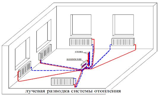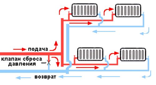 La composition d'un tel système de chauffage comprend des tuyaux d'alimentation et d'évacuation. Le liquide de refroidissement s'écoule par le tuyau d'alimentation vers les radiateurs connectés en parallèle. Par la sortie (retour), le liquide qui a dégagé de la chaleur retourne dans la chaudière. Ce système est bien adapté pour un immeuble à appartements.Mais, malgré tous les avantages, il ne convient pas à tous les objets, car il nécessite une infrastructure développée. Un type de système à deux tuyaux est un câblage de collecteur.