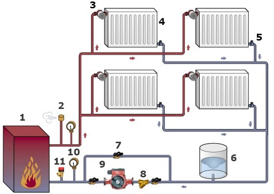 Le liquide de refroidissement de la chaudière est fourni par une colonne montante verticale, puis le long d'une canalisation inclinée jusqu'aux radiateurs de chauffage. Le fluide caloporteur excédentaire est évacué dans le vase d'expansion. Lors de l'utilisation du câblage inférieur, le tuyau d'arrivée est posé au niveau du radiateur ou au-dessus du sol.