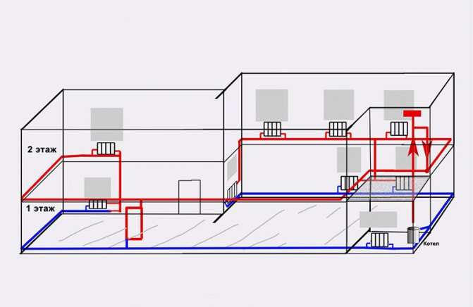 Le système de chauffage à deux tuyaux atteint la plus grande efficacité énergétique dans les bâtiments à deux étages ou plus. Ceci est obtenu grâce à la plus grande différence de hauteur entre l'équipement de la chaudière et les appareils de chauffage. Il augmente la circulation du liquide de refroidissement dans la canalisation, entraînant une combustion plus complète du combustible dans la chaudière.