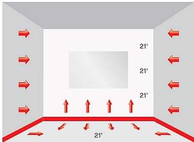 Pendant le fonctionnement des plinthes chauffantes, le maintien d'une température confortable dans la pièce est assuré non seulement en influençant l'air dans la partie inférieure de la pièce, mais également en transférant de la chaleur aux surfaces murales. Afin de réchauffer l'air par convection, il faut dépenser environ 30% de toute l'énergie, et le reste va au chauffage des murs.