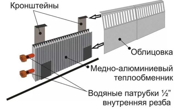 À l'intérieur de l'appareil, il y a des échangeurs de chaleur fixés sur des tubes en cuivre. Toute la caractéristique de cet appareil est sa compacité. L'ensemble de la structure s'insère dans une boîte étroite d'environ quatorze centimètres de haut et trois centimètres de large. De tels appareils de chauffage sont installés autour du périmètre de la pièce et peuvent servir de moyen de chauffage principal et supplémentaire.