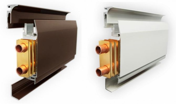 La conception d'un tel système comprend des lamelles en aluminium anodisé, grâce auxquelles un fort chauffage des murs et des surfaces proches est assuré. En raison de l'installation de telles plinthes, un rideau efficace est créé, qui protège parfaitement la pièce de l'air froid.