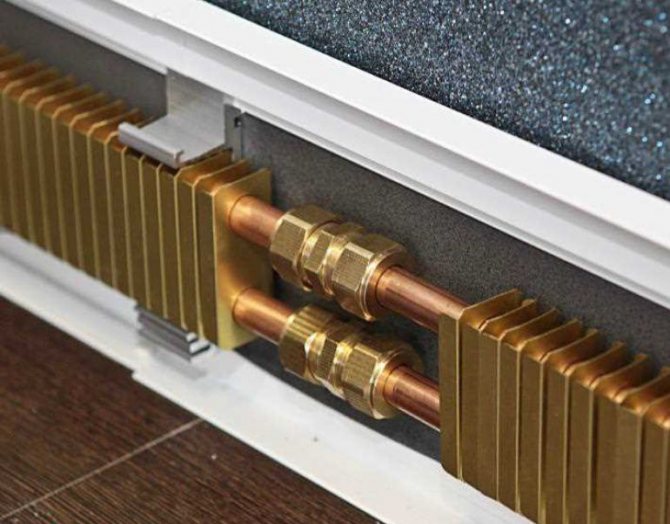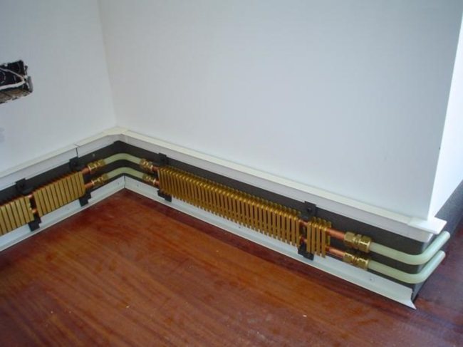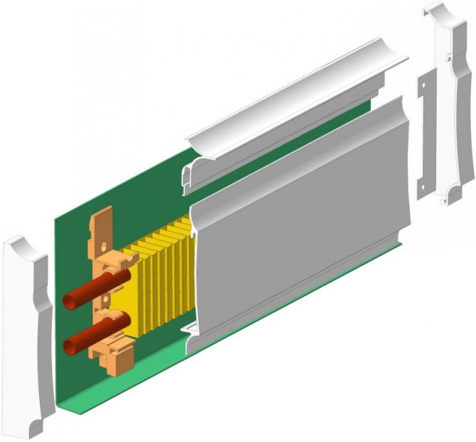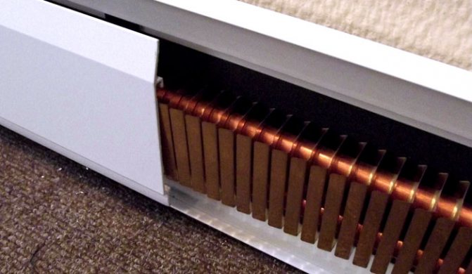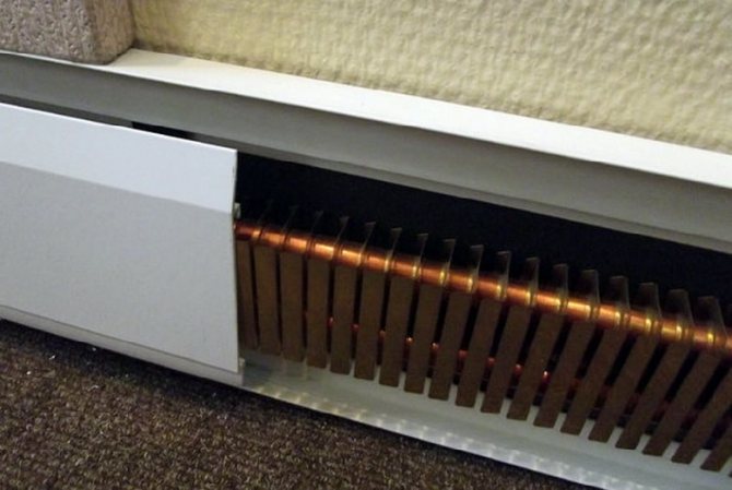Si vous regardez de près cette conception, vous pouvez voir qu'il s'agit d'une idée complètement ancienne, mais modernisée de manière significative. La plinthe chauffante électrique illustrée sur la photo contient des échangeurs de chaleur spéciaux, situés sur des tuyaux en cuivre d'un diamètre d'environ 13 mm.
