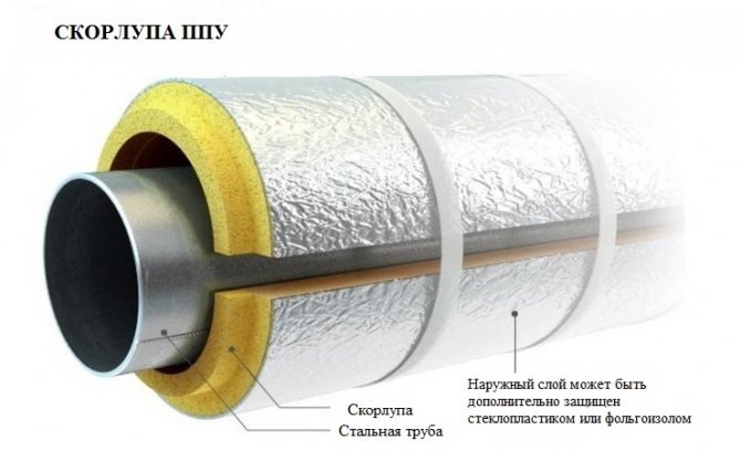 Une coque pour l'isolation des tuyaux en mousse de polyuréthane ou en un autre matériau est utilisée pour maintenir une température constante du fluide circulant à l'intérieur du pipeline, pour protéger les personnes contre les brûlures à des températures de conduite élevées ou basses. Ce matériau est utilisé pour l'isolation: