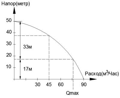Regardez, j'ai marqué 17 mètres avec une ligne pointillée le long de l'horizon et à l'intersection le long de la courbe j'obtiens le débit maximum possible : Qmax.