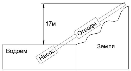 Le tuyau en acier (fer) est posé sur une longueur de 376 mètres avec un diamètre intérieur de 100 mm, le long de la longueur du tuyau, il y a 21 branches (coudes à 90 ° C). Le tuyau a été posé avec une chute de 17m. Autrement dit, le tuyau monte à une hauteur de 17 mètres par rapport à l'horizon. Caractéristiques de la pompe : Hauteur manométrique maximum 50 mètres (0.5MPa), débit maximum 90m 3 / h. Température de l'eau 16°C. Trouvez le débit maximum possible à l'extrémité du tuyau.