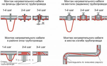 Les éléments individuels de ce type (et ceux-ci comprennent divers robinets, supports, brides, etc.) doivent être enveloppés d'une grande quantité de câble chauffant, car la dissipation thermique dans ces nœuds est beaucoup plus grande. Vous pouvez trouver tous les schémas d'installation nécessaires dans l'image ci-dessous.