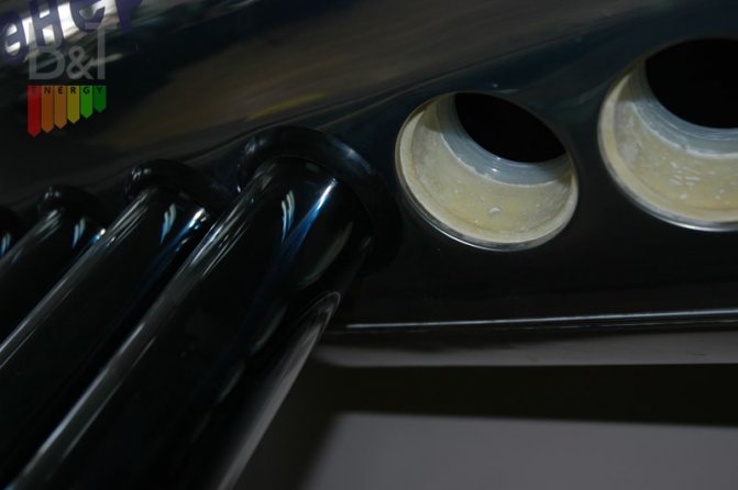 Le collecteur de tube à vide de type U est le plus efficace, mais l'installation est difficile. Lors de l'assemblage, les conduites d'écoulement sont soudées aux tubes de cuivre à l'intérieur de l'ampoule en verre. Le résultat est un système intégré unique avec une efficacité énergétique élevée, mais une faible maintenabilité.