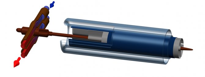 Un échangeur de chaleur sous la forme d'une lettre anglaise U est installé dans un ballon en verre, à travers lequel l'eau coule. De la ligne avec de l'eau froide, il y pénètre, se réchauffe et retourne au tuyau avec de l'eau chauffée.