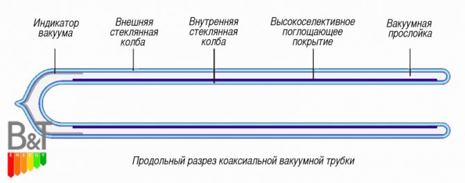 1. Le modèle coaxial d'un capteur solaire sous vide pour chauffer une maison est un double ballon en verre, dans la cavité duquel l'air est évacué. La surface est recouverte d'un revêtement absorbant, de sorte que l'énergie est transférée du tube lui-même.
