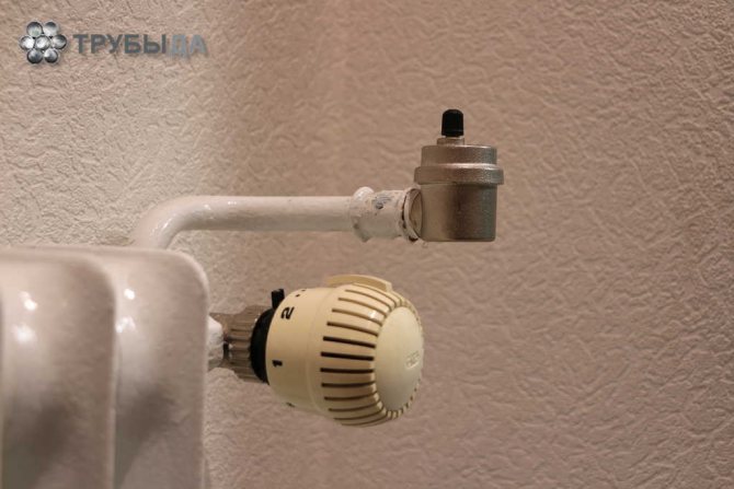 Souvent, pour purger automatiquement l'air des batteries, au lieu du robinet Mayevsky traditionnel, certains utilisateurs installent une vanne d'angle. Cela est vrai dans une combinaison de circonstances désagréable, lorsque des gaz se forment constamment dans le réseau et que cela se produit uniquement dans les radiateurs. La raison en est la réaction chimique de substances parfois présentes dans l'eau avec un alliage d'aluminium de batteries à température élevée. Cela n'a aucun sens d'installer une vanne avec un tuyau d'angle, car il existe un évent automatique spécial pour les radiateurs, illustré sur la photo: